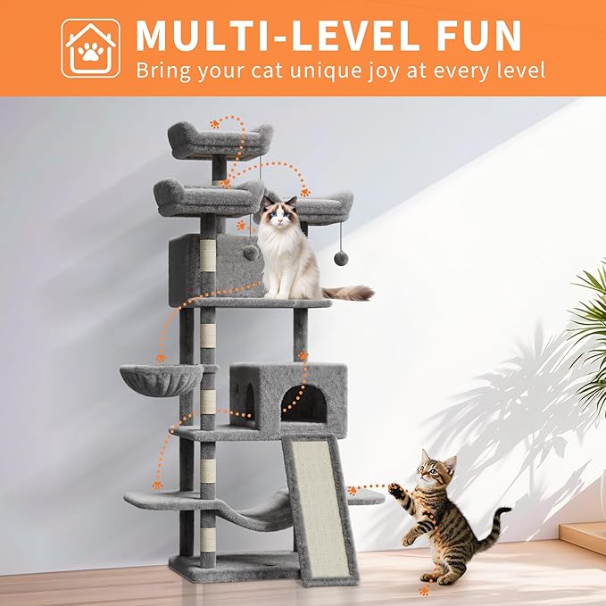 68.5 Inch Multi-Level Cat Tree, Plush Cat Tower with Condo/Sisal Scratching Posts/Hammocks/Basket/Dangling Ball/Platform, Heavy Duty Cats Tree to Play and Sleep, 2605#Light Grey