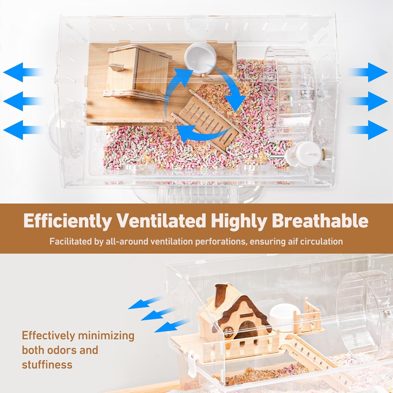 - Excellent Ventilation: For this hamster house, we've enhanced the cage's overall durability, it remains intact even when move around. The acrylic plate of the hamster large has holes on it, which can reduce the odor in the box and provide fresh air for small animals. The well-ventilated design meets the needs of dwarf hamsters, gerbils, Syrian hamsters and most small animals