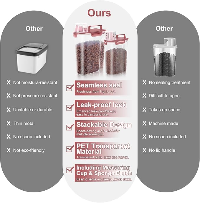 - CAPACITY : Pet dry food storage containers (size and size combination)-our cat food storage container combination capacity is 12 LBS(large pet container is 5-7LBS,small rice container is 3-5LBS) and can hold approximately 10-15 pounds of pet food.It also works well with regular kitchen food.Such as rice,flour,cereal,beans,nuts,snacks or whatever you like