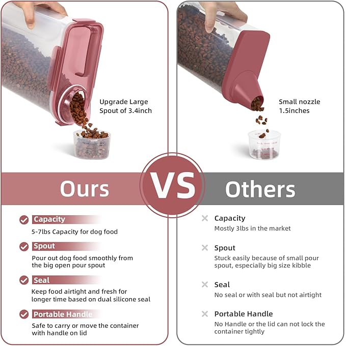 - BENEFITS : Upgraded Large Pour Spout with Measuring Cup-We upgraded the mold so that the pour spout is large enough to pour out large dog food.You can now pour food easily and quickly.The newly upgraded measuring cup can now also be easily screwed onto the nozzle