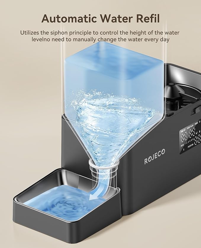 - 【2 in1 Feeder,Scientific Feeding】 2-in-1 Automatic Cat Dog feeder and Water Dispenser, separate feeding water feeder prevents wet food and prevents pets from eating moldy or wet food; 5L food + 3.5L water supports extended travel (2 cats up to 7 days), reducing the possibility of pets going hungry during travel/overtime.
