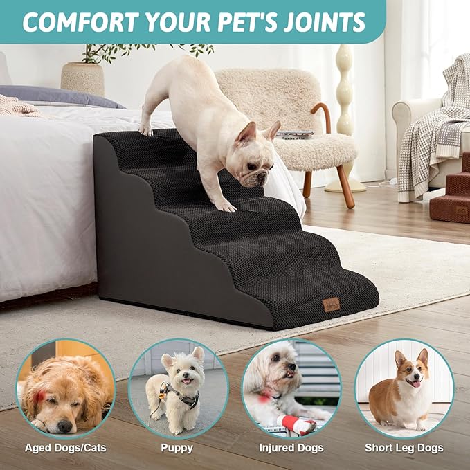 - HIGH DENSITY SPONGE: stairs for dogs to get on the bed adopt 30D high-density pure sponge, which provides better support while providing a soft return contact surface, reducing the pressure on the joints when pets repeatedly jump on high bed, sofa, couch and car. The stairs are covered with high-quality corduroy to provide additional stability