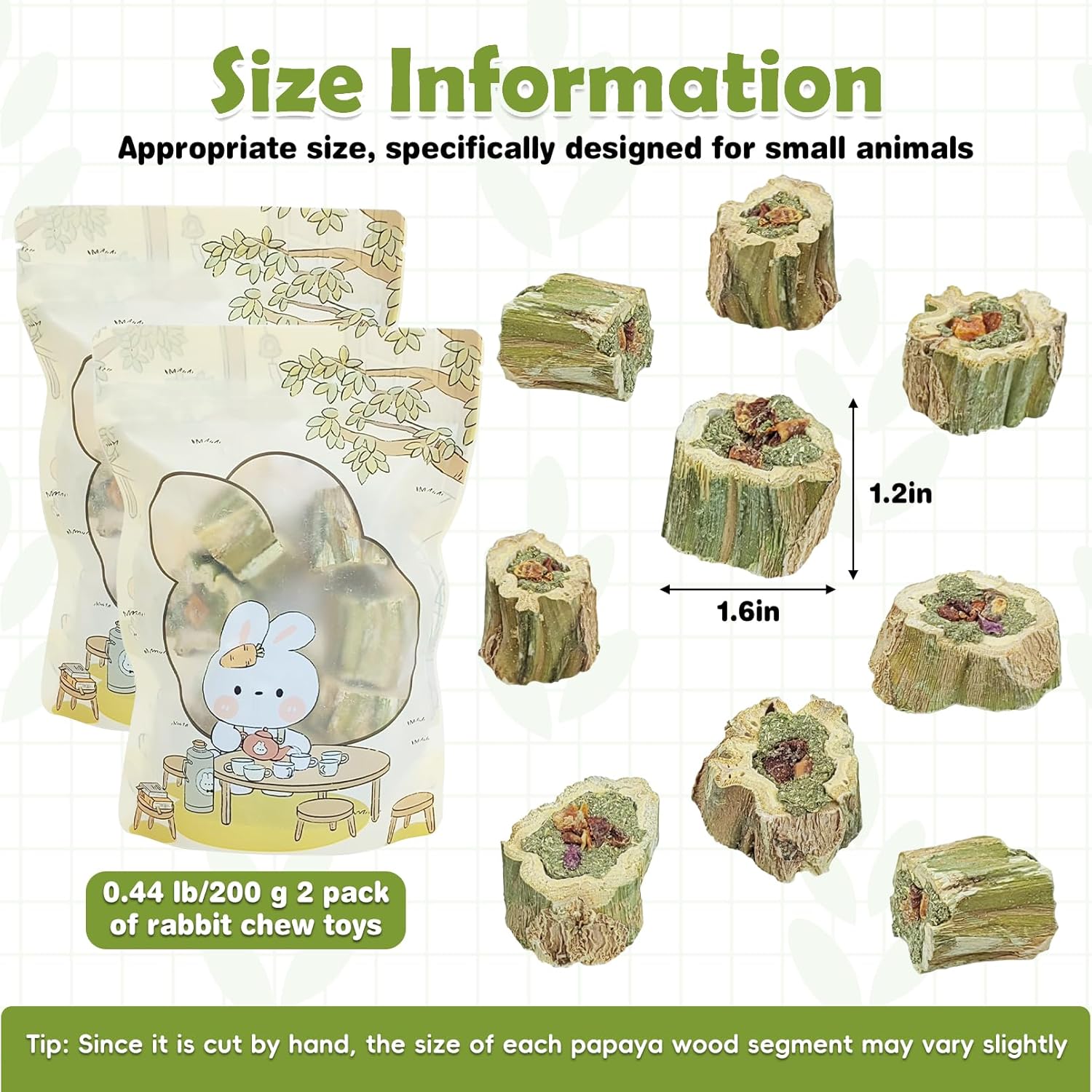 - Help with Teething: Rabbits' teeth grow continuously, and if they are not properly worn down, they may become too long, affecting their ability to eat and their health. Papaya wood rabbit chews are moderately hard, suitable for rabbits to grind their teeth and maintain dental health