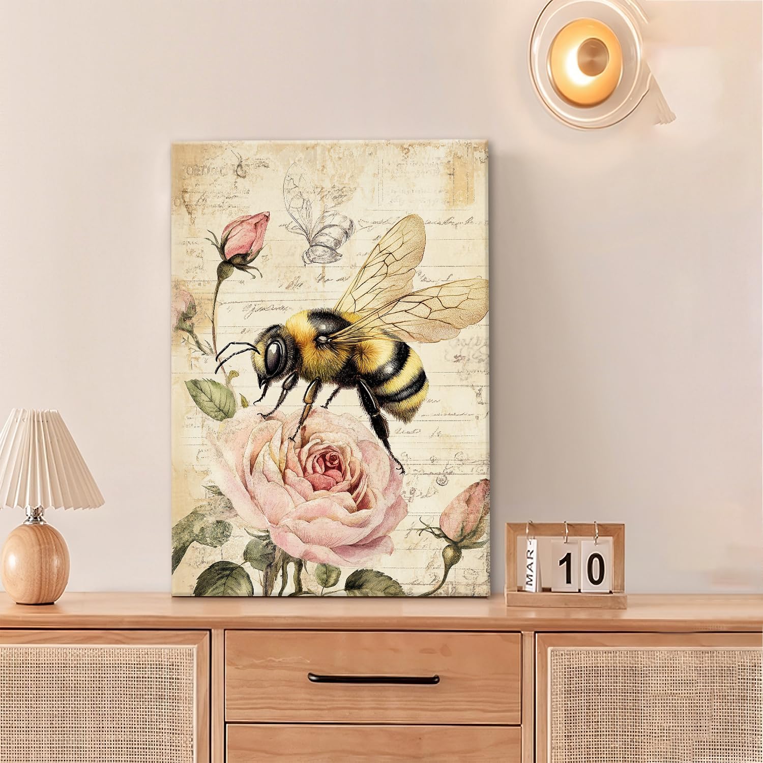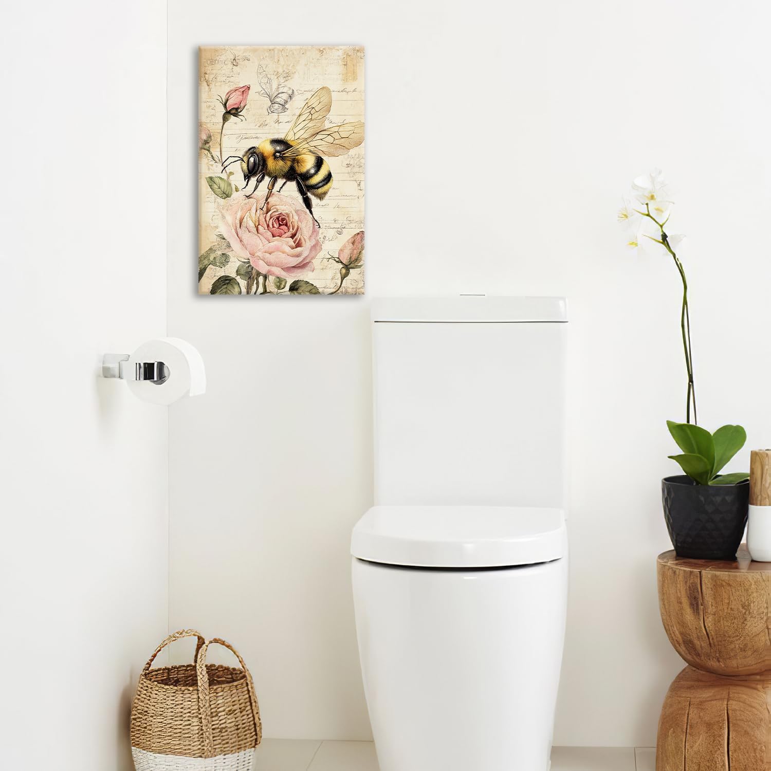 Rustic Bee Bathroom Pictures Wall Art, Vintage Floral Bathroom Wall Decor, Pink Rose Flower Framed Painting Canvas Artwork for Bedroom Living Room Decorations 24"L x 16"W