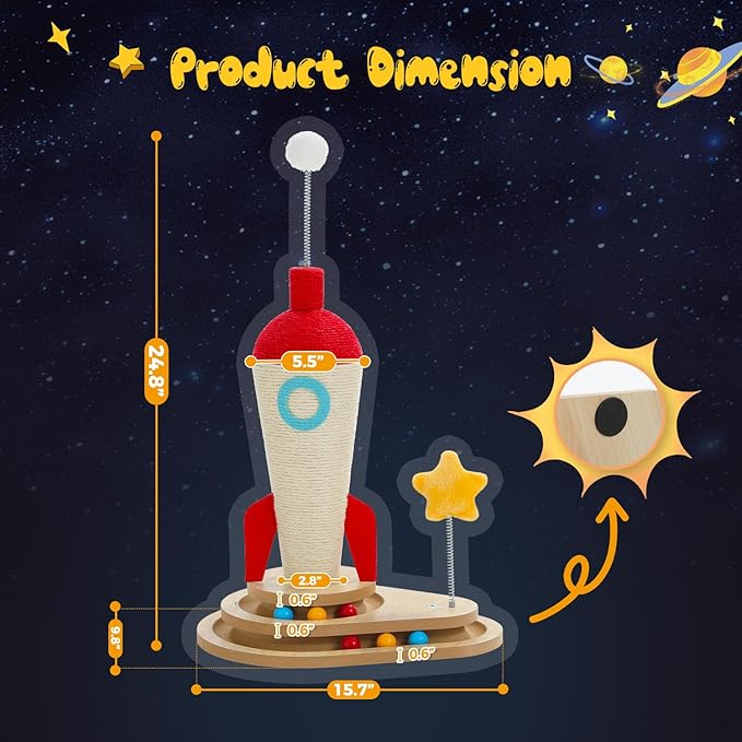 - Interactive Toy: This cat post scratcher is designed with a rocket-shaped structure, 2 attractive spring balls and an interactive wooden track with 6 toy balls, which perfectly satisfy the cat's playful nature