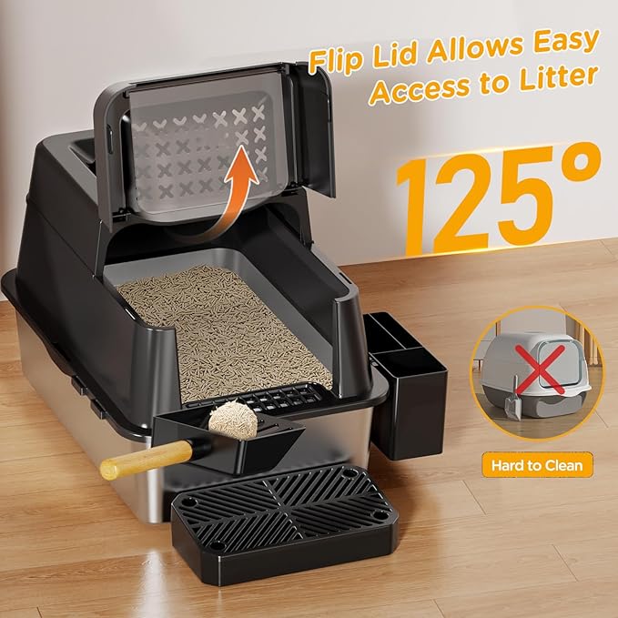 - 【Effortless Cleaning】The stainless steel litter box innovative flip-top lid lets you scoop waste without fully lifting the lid, saving time and effort. For deep cleans, removable components make the process a breeze—ensuring a hygienic home for your feline friend. The ergonomic wooden handle adds comfort, making cleanup stress-free.