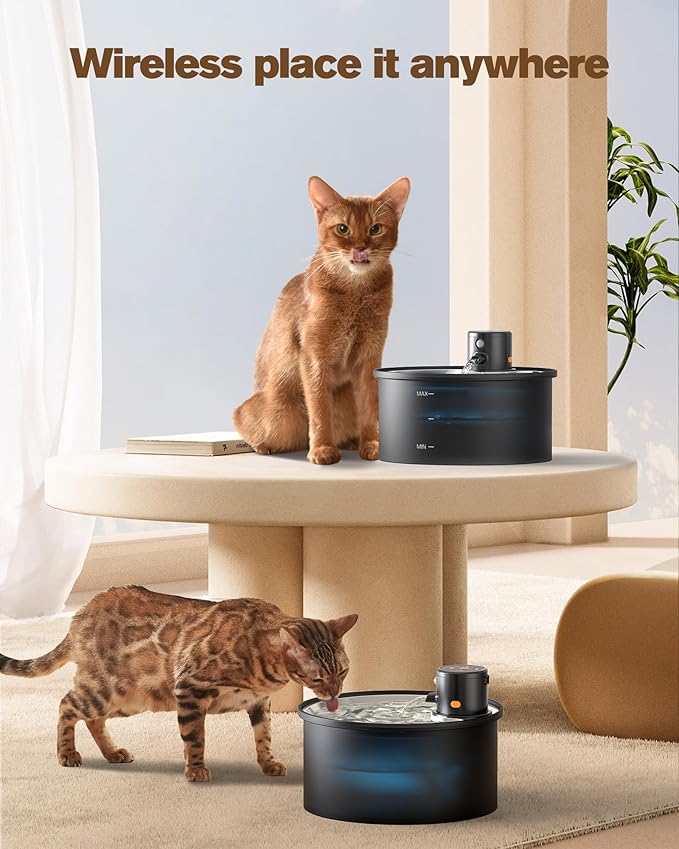 - Cordless, Flexible Placement: Say goodbye to the clutter of tangled wires and enjoy the freedom of placing the VKIMISS wireless cat fountain anywhere in your home. This cat water fountains ensures your beloved cats have access to fresh water at all times, while also preventing the safety hazards of pets chewing on wires