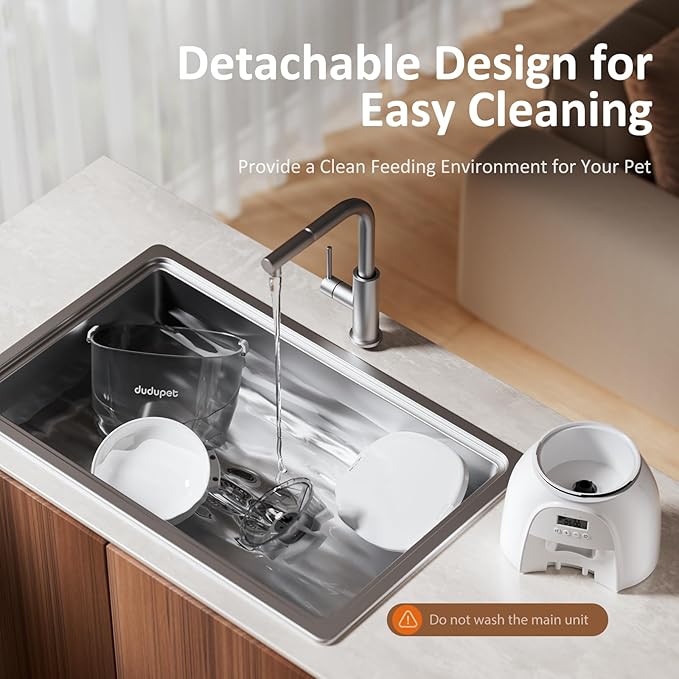 - 【User Friendly Operation】The auto pet feeder with Intuitive LCD screen makes setup and programming a breeze, and press both "+ & -"together to manually dispense 1 portion; All food-contact components, including the food tank and food bowl are detachable and washable, making it easy to keep your feeder fresh and hygienic. Spend less time cleaning and more time with your pet. The 12-hour clock is easy to program and understand.