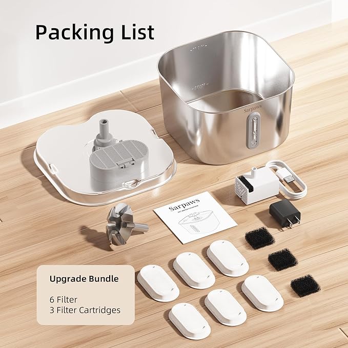 - 【DURABLE STAINLESS STEEL】 Built with food-grade SUS 304 stainless steel, our cat water fountain offers exceptional durability for long-term use. Unlike plastic bowls prone to scratches that can trap grime, cat fountain‘s smooth, rust-resistant surface helps maintain a cleaner environment for your pet's water. For effortless upkeep, the stainless steel components are detachable and conveniently dishwasher safe