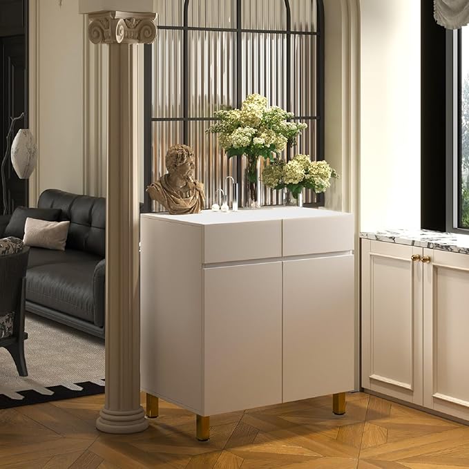 - Stylish Design: This modern litter box enclosure combines white wood with gold metal accents, seamlessly blending into any home decor as an elegant furniture piece.