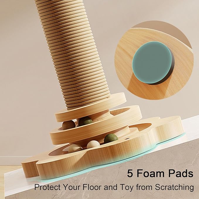 - Scratching Post With Cat Toys: This cat scratch post features 2 interactive hanging sisal balls and 1 interactive spring-loaded feather wand to add more fun to your cat's playtime. The base also includes a cat ball track with 6 interactive toy balls to stimulate curiosity and satisfy your cat's natural instincts.