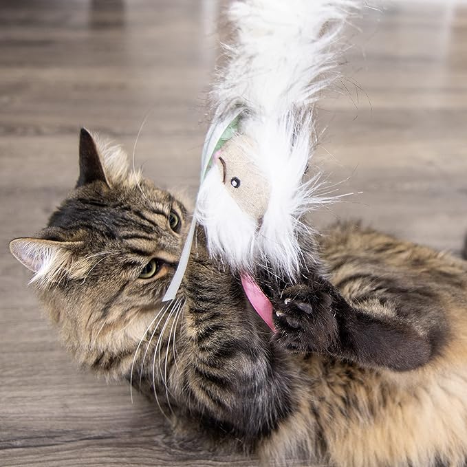 - FEEL OF REAL PREY: The touch-activated cat toy features a soft plush body, ribbons, and real feathers, mimicking the multitextured feel of real prey to stimulate your kitty's hunting instincts and further entice play