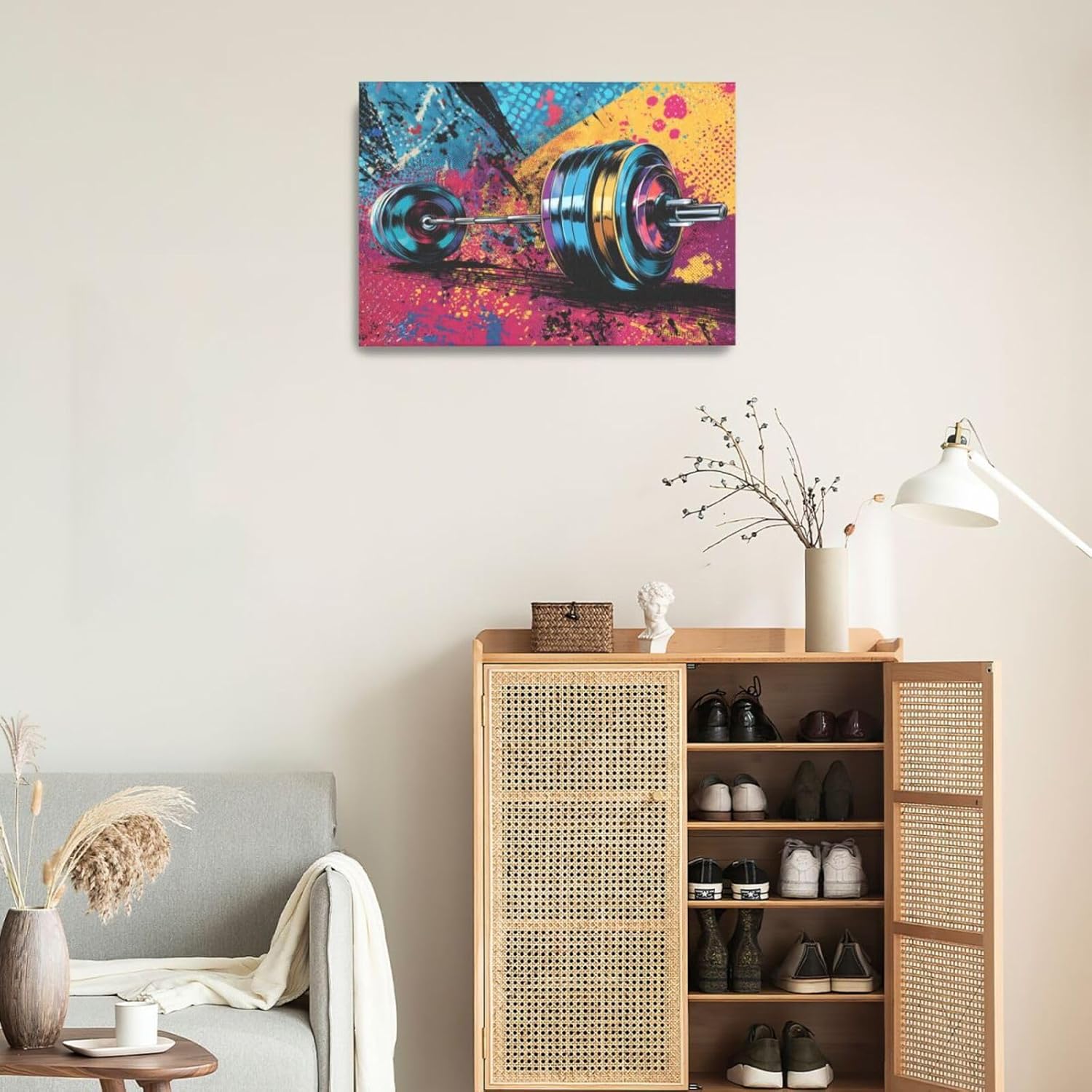 Gym Wall Art Weightlifting Fitness Canvas Wall Decor Barbell Sports Training Pictures Painting Banksy Street Graffiti Print Artwork Framed Decorations Gifts for Sports Lovers Gym Living Room Bedroom 16"x24"