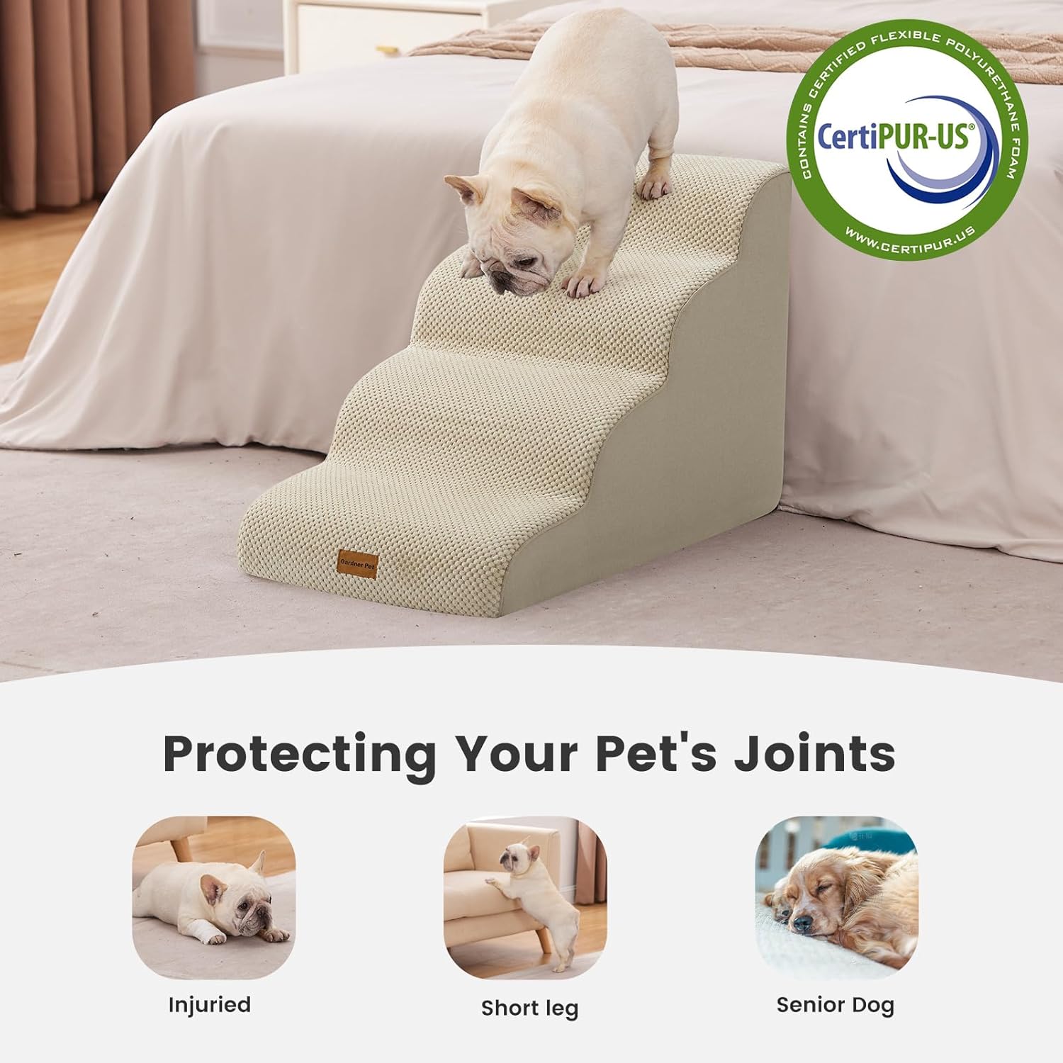 - Stable & Secure with Anti-Slip Base: Designed with rubber dots on the bottom, these pet steps for small dogs provide excellent grip and stability, preventing slips and falls. Your pet can climb confidently and safely. Choose from dog ramp for couch, chair and sofa (up to 18"), 3-step dog steps for couch (up to 20"), 4-step dog steps for bed (up to 25"), or 5-step (up to 28") dog steps for high bed, window and car.