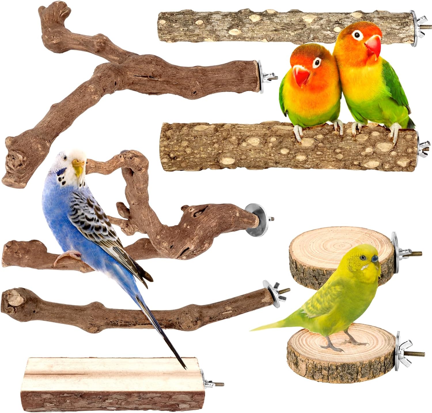 Natural Wood Bird Perches for Cage, Parrot Perch Stand & Platform, Bird Cage Accessories for Parakeets, Cockatiels, Conures, Lovebirds (Brown, Natural Grapewood Variety Set - 8PCS)