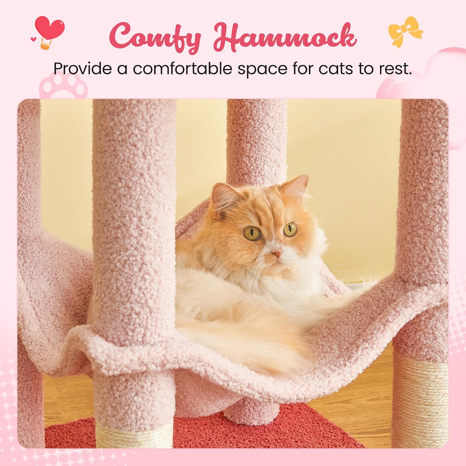 - Pink Palace for Your Furry Queen: Plush hammock for sleep, multi-level for climbing, cozy condo for relaxing, heart-shaped dangling balls for playing. It meets all the needs of cats