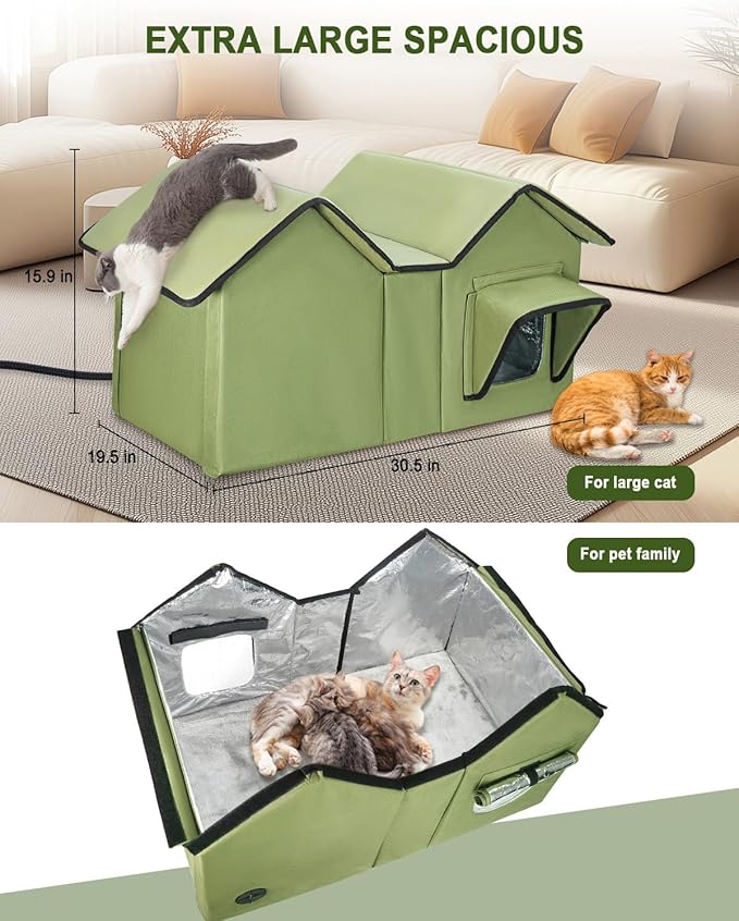 Extra Wide Large Heated Cat House for Outside, Elevated Waterproof Outdoor Cat House Weatherproof for Winter, Insulated Outdoor Cat Shelter with Escape Doors and Heating Pad for Multiple Cats, Green