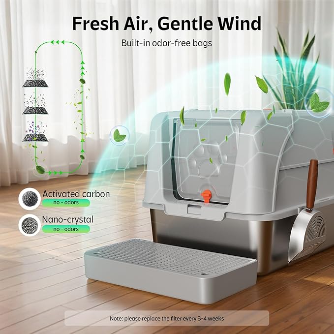 - All - in - One Convenience : Our covered litter box comes with a removable lid, a built - in scooper and carbon filters. This all - in - one solution makes it easy to keep the litter box clean and odor - free. The extra - large stainless - steel box is designed to grow with your cat. We also offer a 6 - month warranty against defects, scratches, and shipping - related damage.