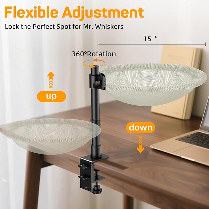 - 【360° Rotating & Height Adjustable】: Give your cat the ultimate vantage point! This ingenious elevated cat desk bed basket spins smoothly a full 360 degrees, letting your curious feline effortlessly survey their entire domain without leaving their cozy perch. Plus, easily adjust the height to find their purr-fect viewing level, whether they want to watch birds outside or keep an eye on you working. Keeps them entertained and close, all while saving precious desk space.