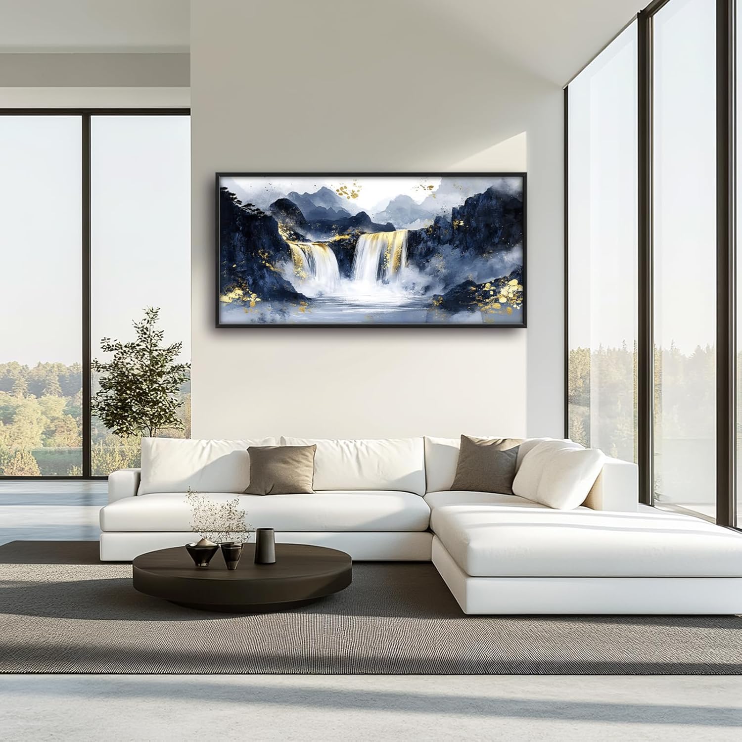 - 【Unique Design】 Waterfall, with gold foil embellishment, a blue and gray color scheme, and mountains in the distance. The waterfall flows down from the top left to the bottom right of the picture, with an ink splashing effect. The upper half of the canvas features white space, with additional ink splash effects.
