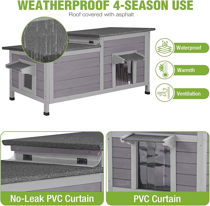 - All-Season Design: This outdoor cat shelter features a sturdy structure and weatherproof design, suitable for year-round use. Whether it's a hot summer or a cold winter, it provides a comfortable home for your cat. The roof is covered with asphalt to effectively prevent leaks, ensuring the interior remains dry.