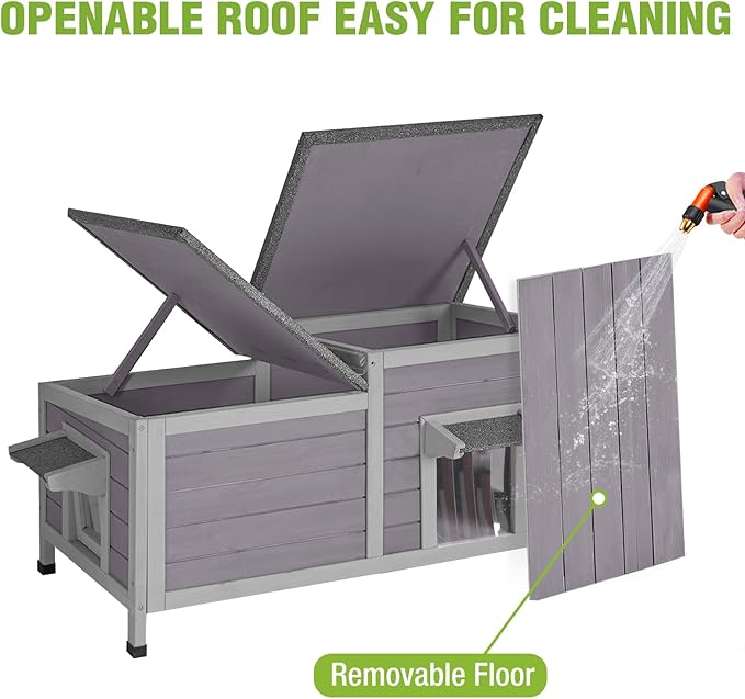 - Easy to Clean: Equipped with the removable floors and two large opening roofs, the cat shelter allows for easy cleaning of the interior. The roof PVC curtain effectively prevents rainwater from seeping in, keeping the interior dry. The plastic feet cover design prevents ground moisture from affecting the structure of the cat shelter.
