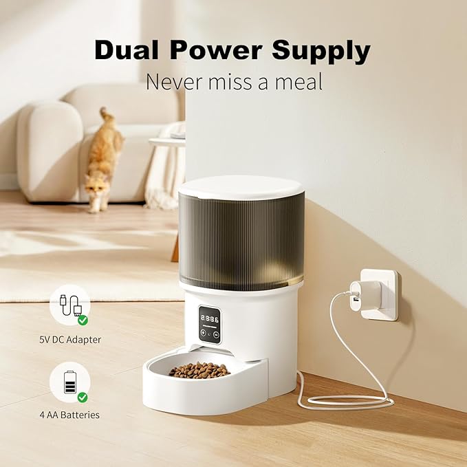 - Automatic Cat Feeder and Water Combo Set: The auto cat feeder and water dispenser are designed as one unit, perfectly meeting your cat's dietary needs. The 4L large-capacity food storage compartment + 3L water fountain tank provide enough capacity for several days of use. The dual power supply (plug-in/4 AA batteries-not included) ensures uninterrupted operation, making it ideal for busy households and short trips.