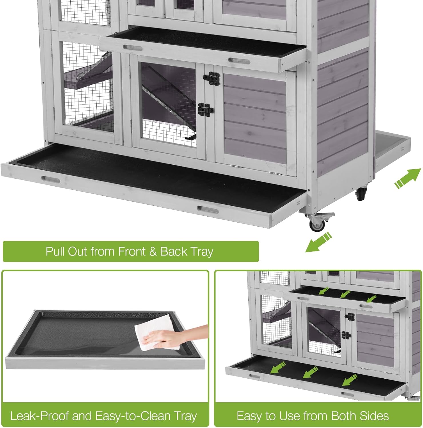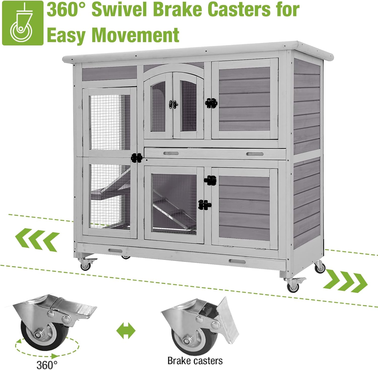 - Mobile Rabbit Hutch with Secure Casters: Four smooth-rolling casters allow easy relocation of the bunny hutch, with two lockable brakes ensuring stability and safety on any surface.