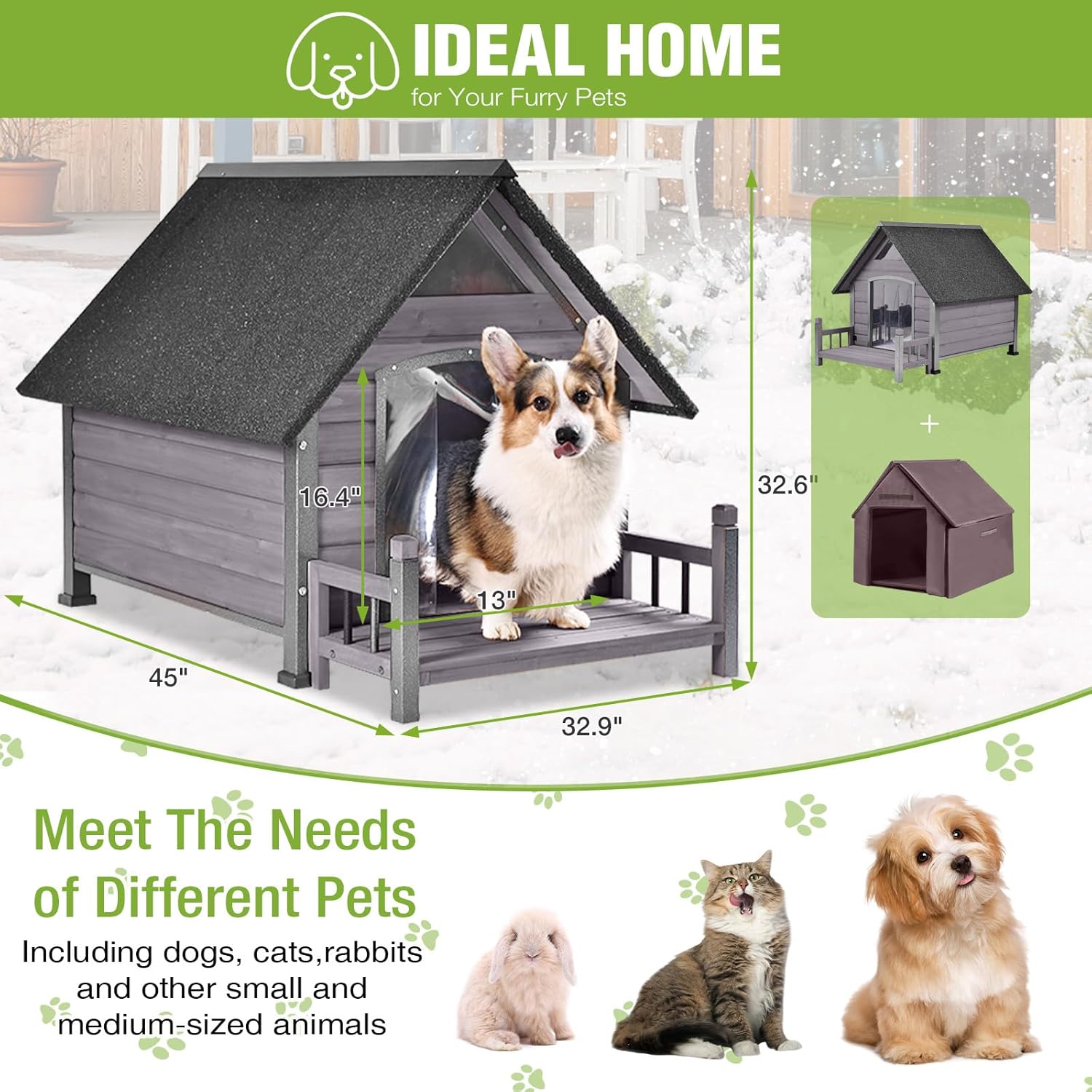 - SPACIOUS SPACE FOR MULTI BREEDS:Measuring 45in(L)×32.9in(W)×32.6in(H) with a roomy entrance of 16.4in(H)×14in(W), our Dog House is perfectly sized for small and medium dogs. Suitable for both indoor and outdoor use, it's the perfect Puppy Shelter for any family pet