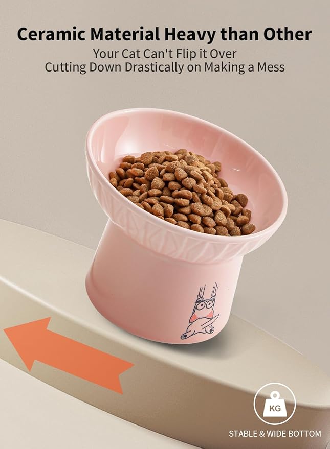 - Wide Cat Food Dish: The raised cat dish is shallow and wide to keep your cat's whiskers from touching the edge of the dish while eating, prevents whisker fatigue and keeps its face clean.