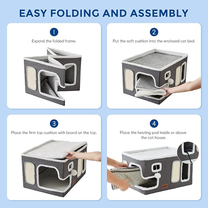 Heated Cat House for Indoor Cats - Large Cat Warming Bed for Winter with Fluffy Ball Hanging and Adjustable Heating Pad, Foldable Cat Hideaway,23x16.5x13 inches, Green