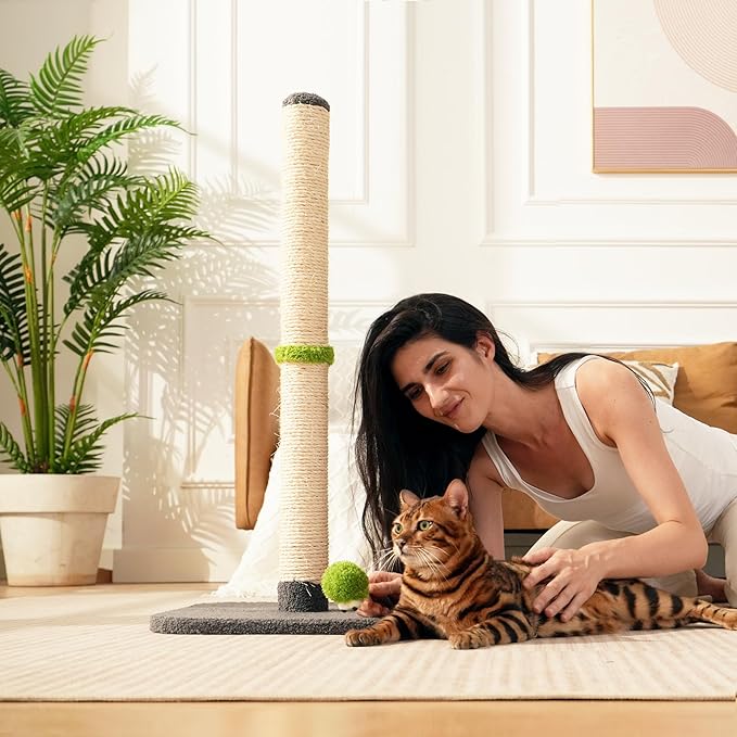 TINYBEAST 34" Tall Cat Scratching Post for Indoor Cats, Premium Natural Sisal Scratcher with Interactive Plush Toy Ball, Reinforced Stable Base for Large Adult Cats & Kittens(Grey)