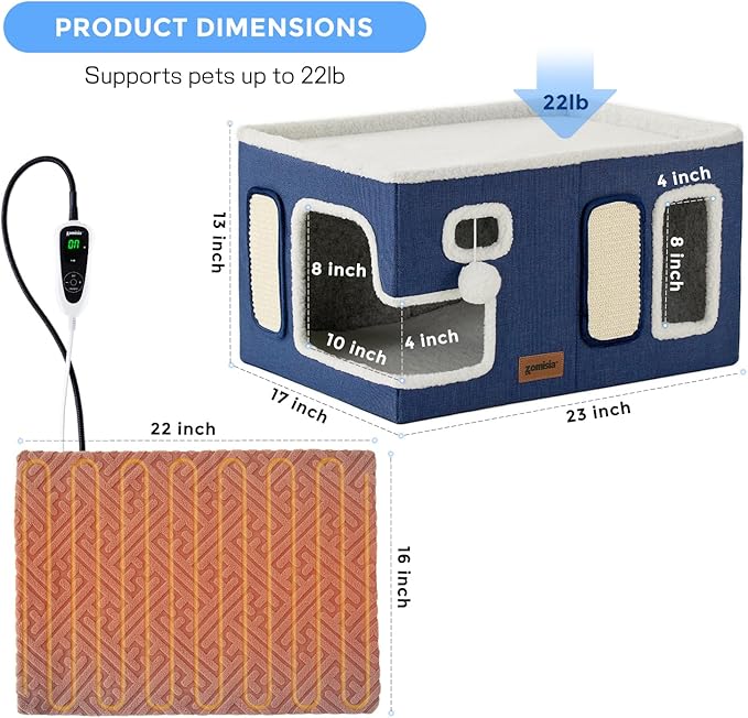 Heated Cat House for Indoor Cats - Large Cat Warming Bed for Winter with Fluffy Ball Hanging and Adjustable Heating Pad, Foldable Cat Hideaway,23x16.5x13 inches, Navy Blue