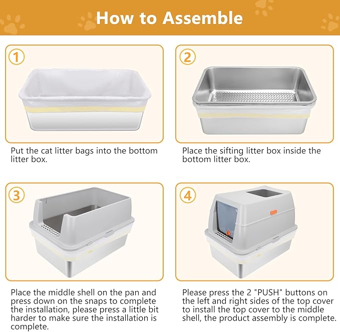 - 【Pine Litter Sifting Cat Litter Box 】: The sifting pan has 0.2-0.3 inches multi-hole design for pine cat litter with special elliptic holes does not stuck the non-clumping cat litter and helps filter urine quickly, while the bottom pan is covered with a super absorbent pee pad, keeping the large metal cat litter box clean and tidy, providing double protection for odor control.In addition, we provide 20 cat sandbags, which only need to be replaced during cleaning