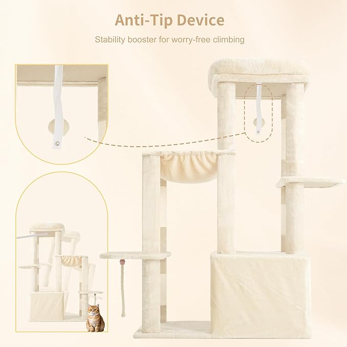 Heybly Heavy Duty Cat Tree, Tower for Indoor Cats Large Adult, Tall Cat Condo House with Extra-Large Baseboard, Multi-Level Plush Furniture with Scratching Posts, Hammock, Toy Ball, Beige HCT026M