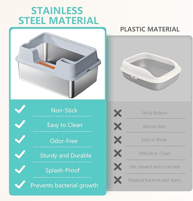 - Anti-Leak Covered Design:This stainless steel litter box with lid features a snug-fitting top cover and 10.6-inch tall high side walls—double protection to stop urine from splashing out and prevent litter from being kicked onto the floor. No more cleaning up scattered litter or wiping urine stains off the floor; the enclosed design locks in messes, keeping your home clean and tidy. The lid also helps reduce odor diffusion, enhancing the overall freshness of the room
