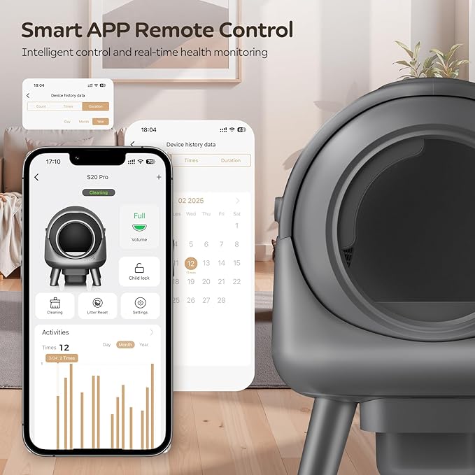 - Smart App Control & Custom Cleaning: Remotely monitor and adjust settings via 2.4GHz Wi-Fi and the free companion app. Track litter levels, usage patterns, and receive maintenance alerts. Choose between auto-clean schedules or manual cleaning with a single button press.