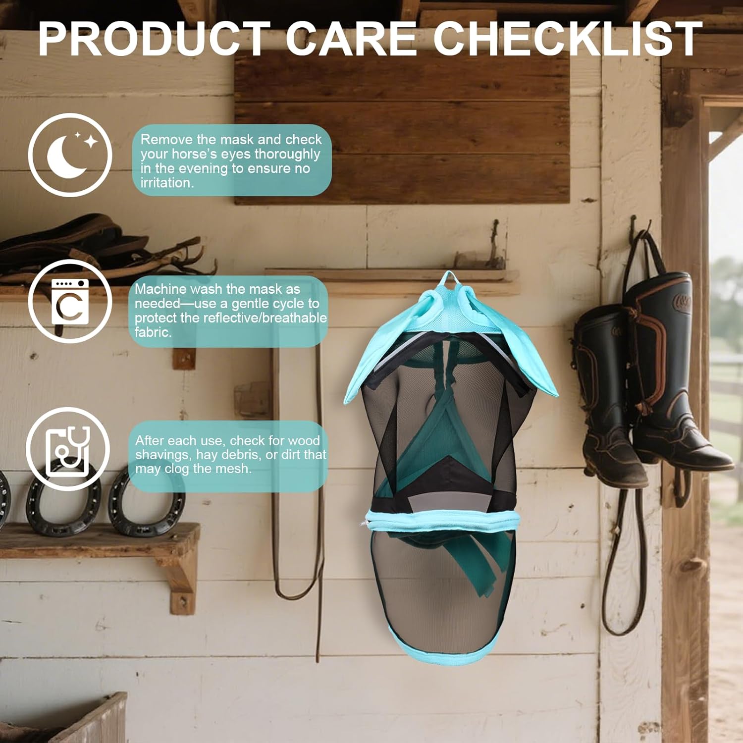 - 【High-Spec UV & All-Scenario Pest Defense】 Our lab-certified horse fly mask, an anti-fly mesh horse mask with UV protection, blocks 60%-90% of UV rays. This fly mask for horses shields light-skinned or blue-eyed horses from sunburn and infections. The dense micro-mesh of our fly mask covers face, eyes, ears, and nose, fending off horseflies, ticks, and pollen. Suitable for grazing to riding, our fly masks for horses with ears—including pony and mini horse options—ensure all-scenario protection.