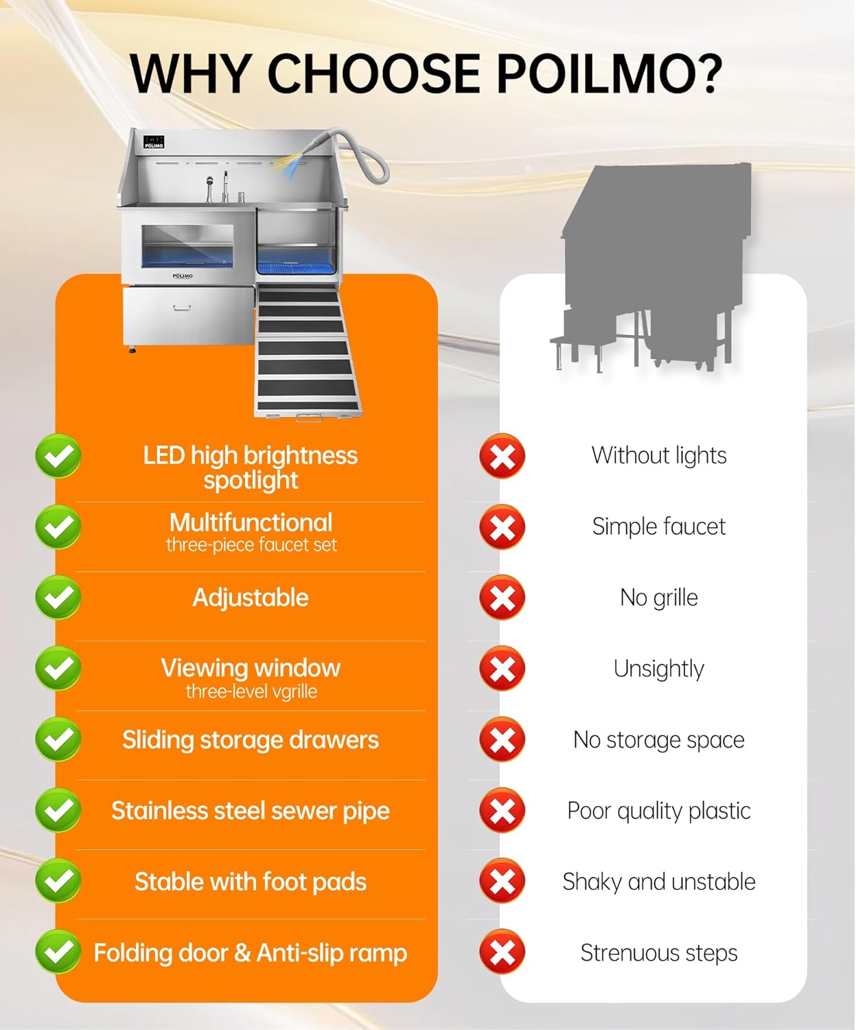 - Premium Stainless Steel Build & Smart Design : Crafted from rust-resistant 304 stainless steel with a full-welded, leak-proof structure, this dog tub is built to last. It features a Grade-A tempered glass viewing window (Eases pet anxiety); A foldable ramp (For easy access, especially for senior dogs); A removable two-piece floor grate (3 height adjustments for large, medium, and small dogs); And a sliding storage drawer (Keeps grooming tools organized). Every detail is designed for a more professional, comfortable, and efficient dog shower tub experience