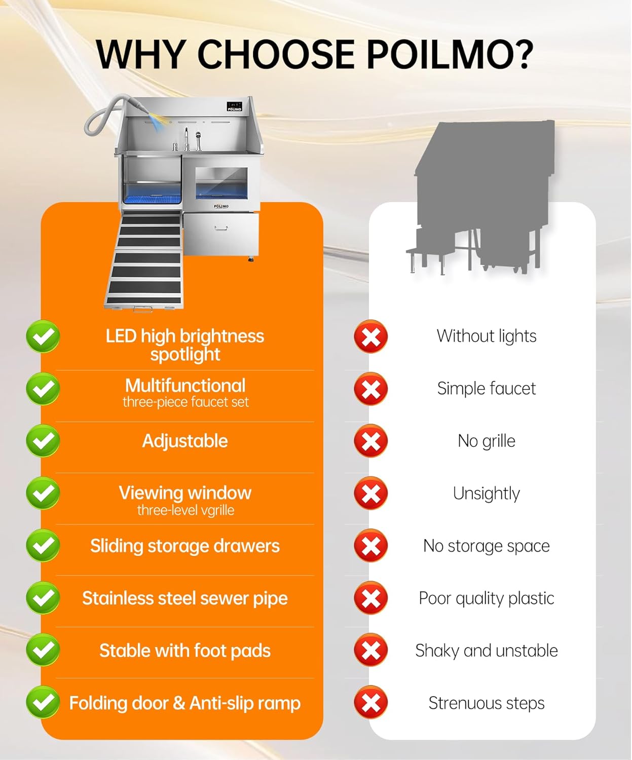- Premium Stainless Steel Build & Smart Design : Crafted from rust-resistant 304 stainless steel with a full-welded, leak-proof structure, this dog tub is built to last. It features a Grade-A tempered glass viewing window (Eases pet anxiety); A foldable ramp (For easy access, especially for senior dogs); A removable two-piece floor grate (3 height adjustments for large, medium, and small dogs); And a sliding storage drawer (Keeps grooming tools organized). Every detail is designed for a more professional, comfortable, and efficient dog shower tub experience