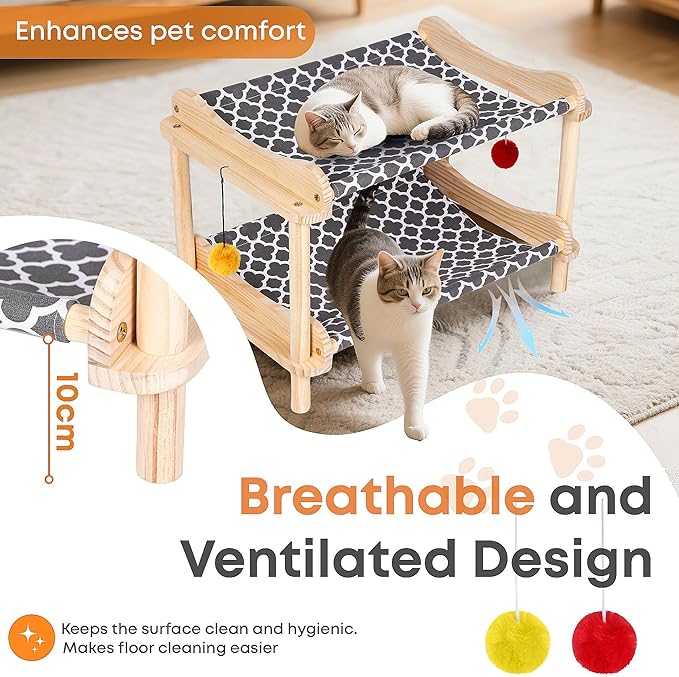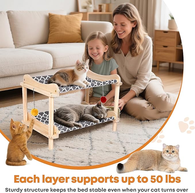 - Strong & Stable – Holds Up to 50 lbs The elevated cat bed is built with a reinforced structure that supports up to 50 lbs per layer. Cats can jump, roll, and stretch freely without wobbling—ideal even as a cat hammock for large cats or a secure elevated dog bed for small breeds