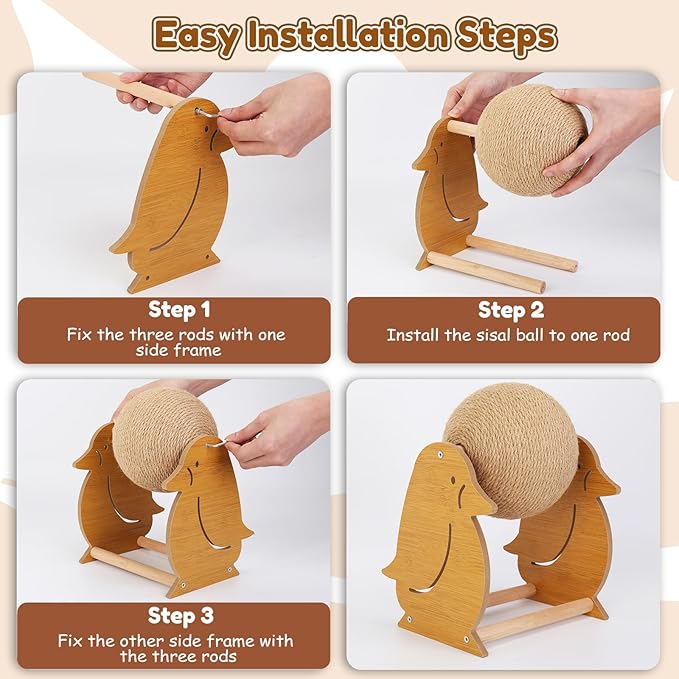 - Durable Cat Ball Toy - The cat scratcher ball toy is composed of sisal scratching ball and cute penguin shaped stand, fixed with durable screws, the sisal playing ball is anti-scratch, for long time use.