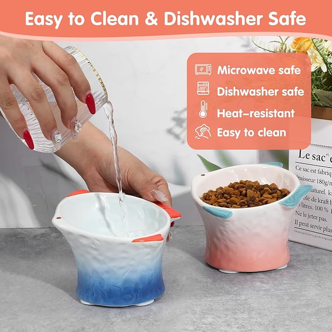 - Quality Material: The package contains 2 fish-shaped elevated cat bowls, which are made of high-quality ceramic, durable and sturdy. The ceramic material makes it scratch-resistant and a reliable choice for daily use. In addition, ceramic is a safe material for pet feeding, so these ceramic cat food bowls can provide a hygienic and safe option for feeding time.
