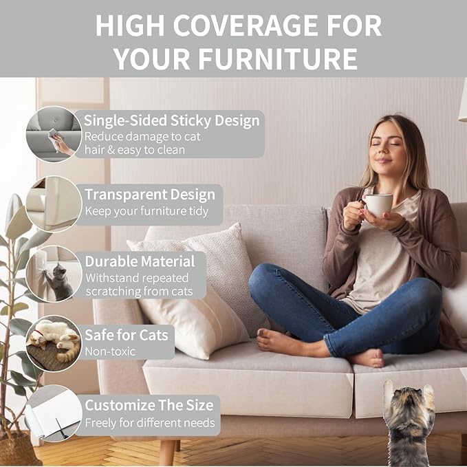 - Almost Invisible - The 12in x 197in anti cat scratch furniture protector offers transparency, blending seamlessly with furniture. This cat scratch deterrent for furniture preserves the original look of décor while protecting against cat scratches. Maintain the beauty of sofas, chairs, tables, and other surfaces without compromising on protection. The clear design ensures it remains unnoticed while safeguarding cat supplies, kitten supplies, and cat products.