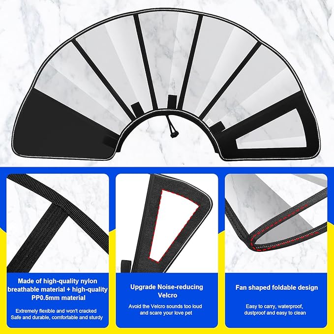 - 🔥【Soft & Fully Transparent Design】Unlike rigid plastic cones, this dog collar made of soft high quality PP 0.5 mm waterproof transparent material, which has nice flexibility and crack resistance and scratch resistance,making it very durable. Wider forward visibility compared to traditional cones, can effectively reduce the anxiety and fear of your loved pet, allowing it to eat, drink, and move more comfortable and naturall