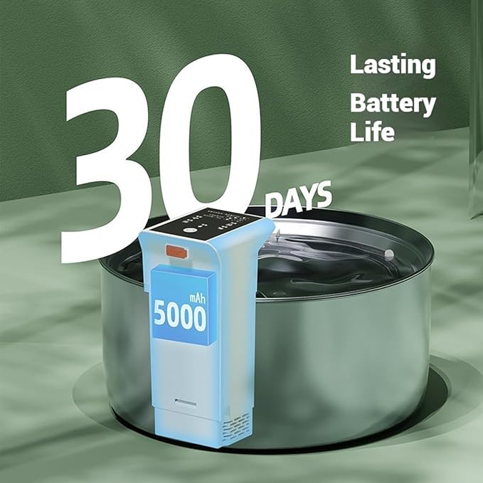 - 【Water and Battery Separation Design】Our upgraded Flowzy wireless cat water fountain features separate water and battery components for enhanced safety compared to internal batteries,simply detach the battery and charge it independently. Fully charged 5000mAh battery can operate up to 30 days, 7L capacity meets an adult cat's water needs for 10-15 days, granting you peace of mind during traveling