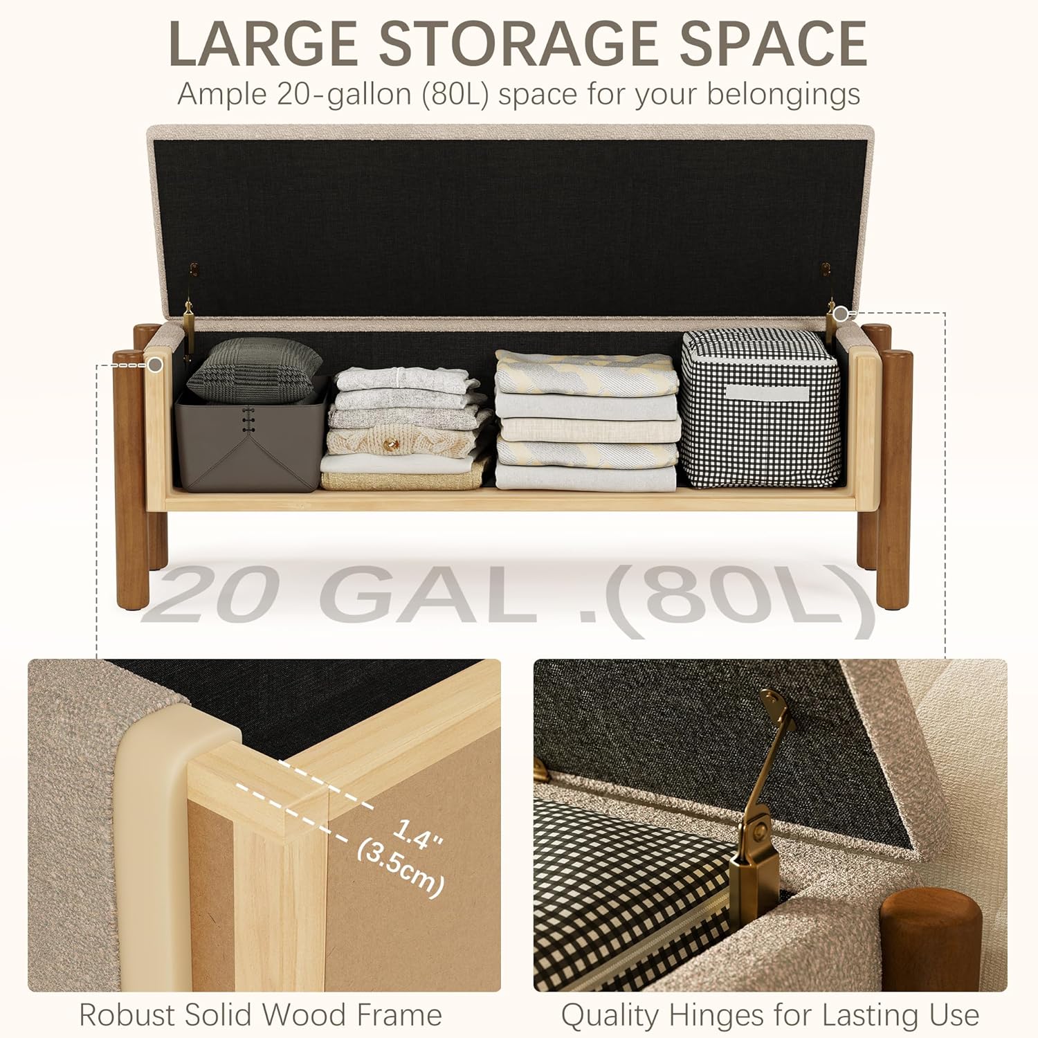 Modern Storage Benches with Walnut Wood Legs, 47'' Ottoman Bench with 20 Gallons Storage Space for Bedroom End of Bed, Fabric Upholstered Entryway Bench with Seating for Livingroom, Beige