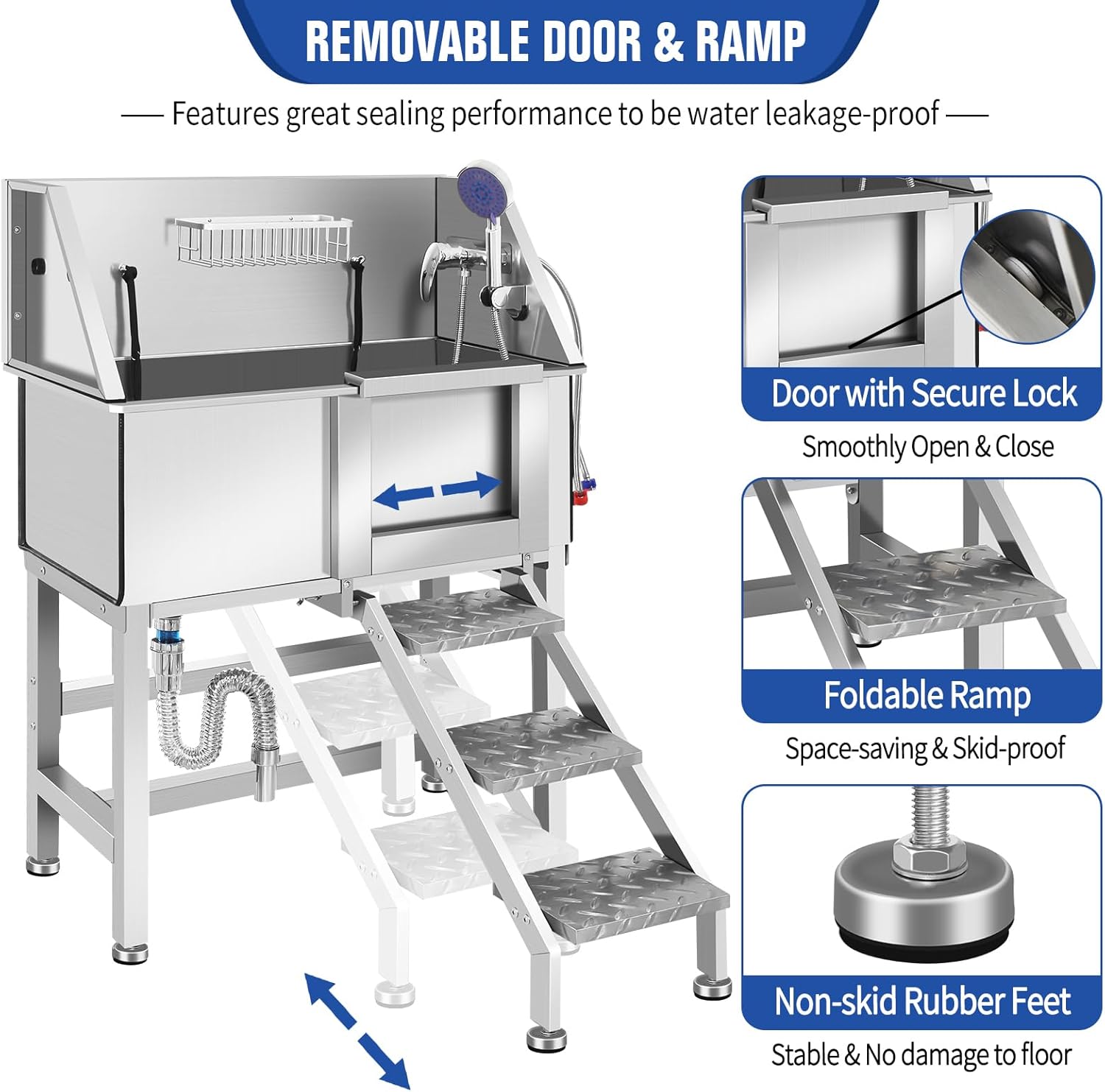 Stainless Steel Dog Washing Station, Pet Grooming Tub W/Storage Stairs, Faucet & Showerhead & Soap Holder Dog Bathtub for Large & Medium & Small Pets,34" R-RAMP