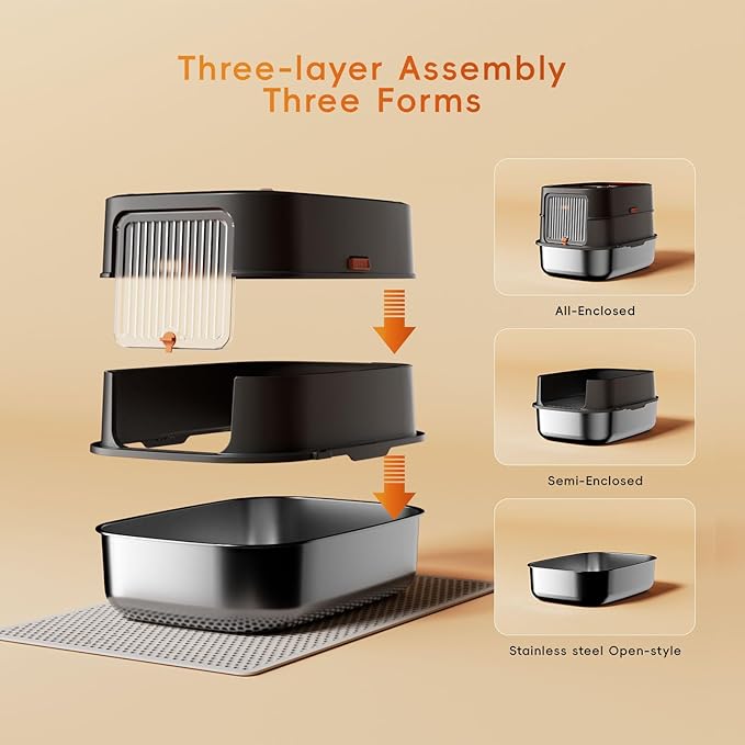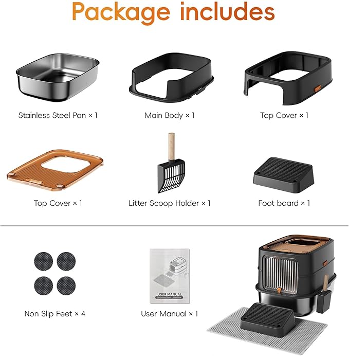 - Easy Clean & Full Set: This easy clean litter box has a detachable design. The enclosed stainless steel litter box comes with pedal, litter tracking mat, and cat litter scoop set.