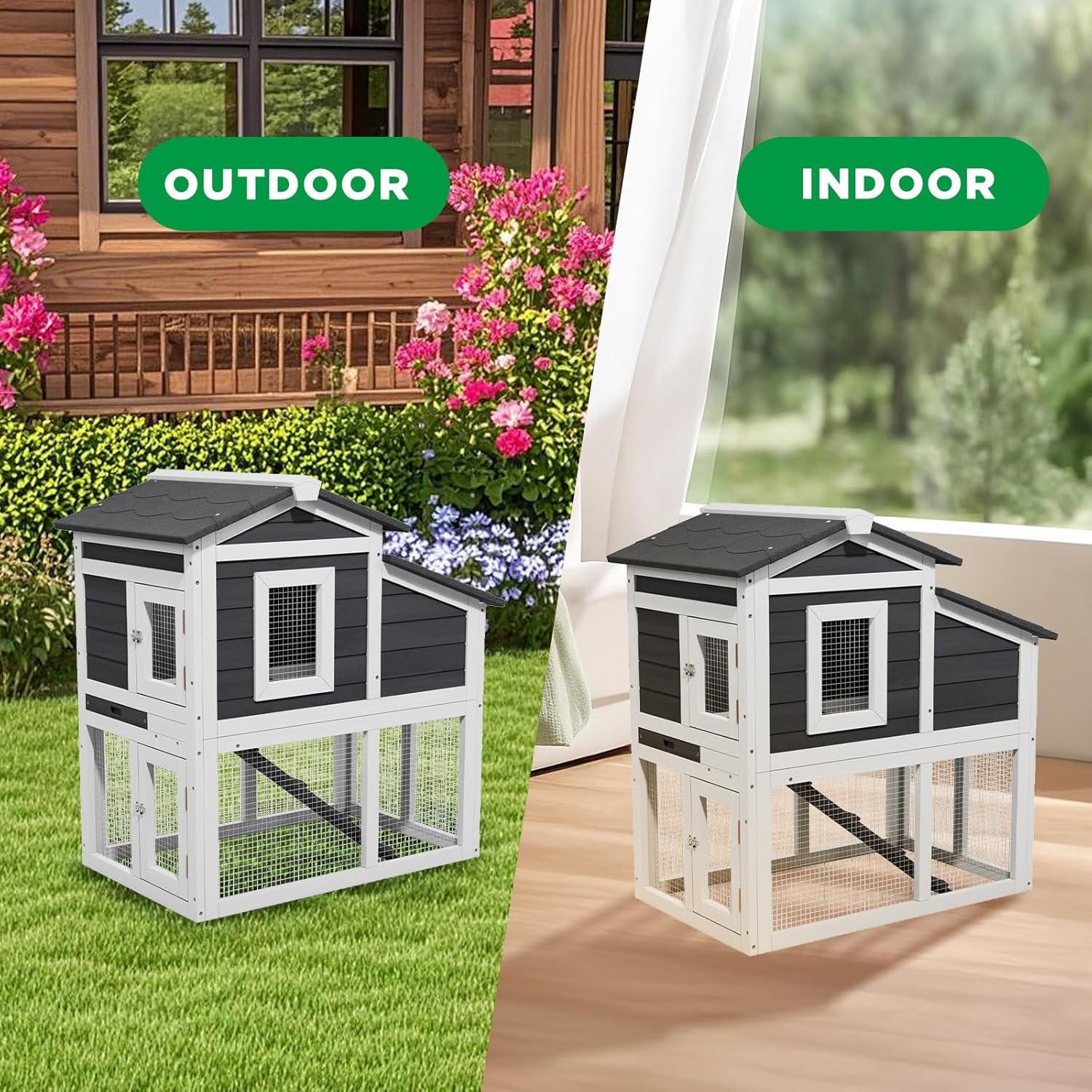 2 Story Rabbit Cage, Weatherproof Rabbit Hutch Indoor & Outdoor, Wooden Guinea Pig Cages with Removable Tray Openable Roof for Small to Medium Animals